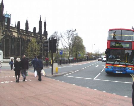 university church. A fine row of plane trees has been removed and the churchyard wall moved to accommodate the road widening scheme. That bus and cycle lane on the left is new. |